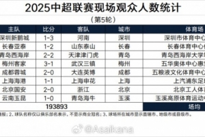 2025中超联赛第5轮所有比赛现场观众人数统计如下(主队在前):